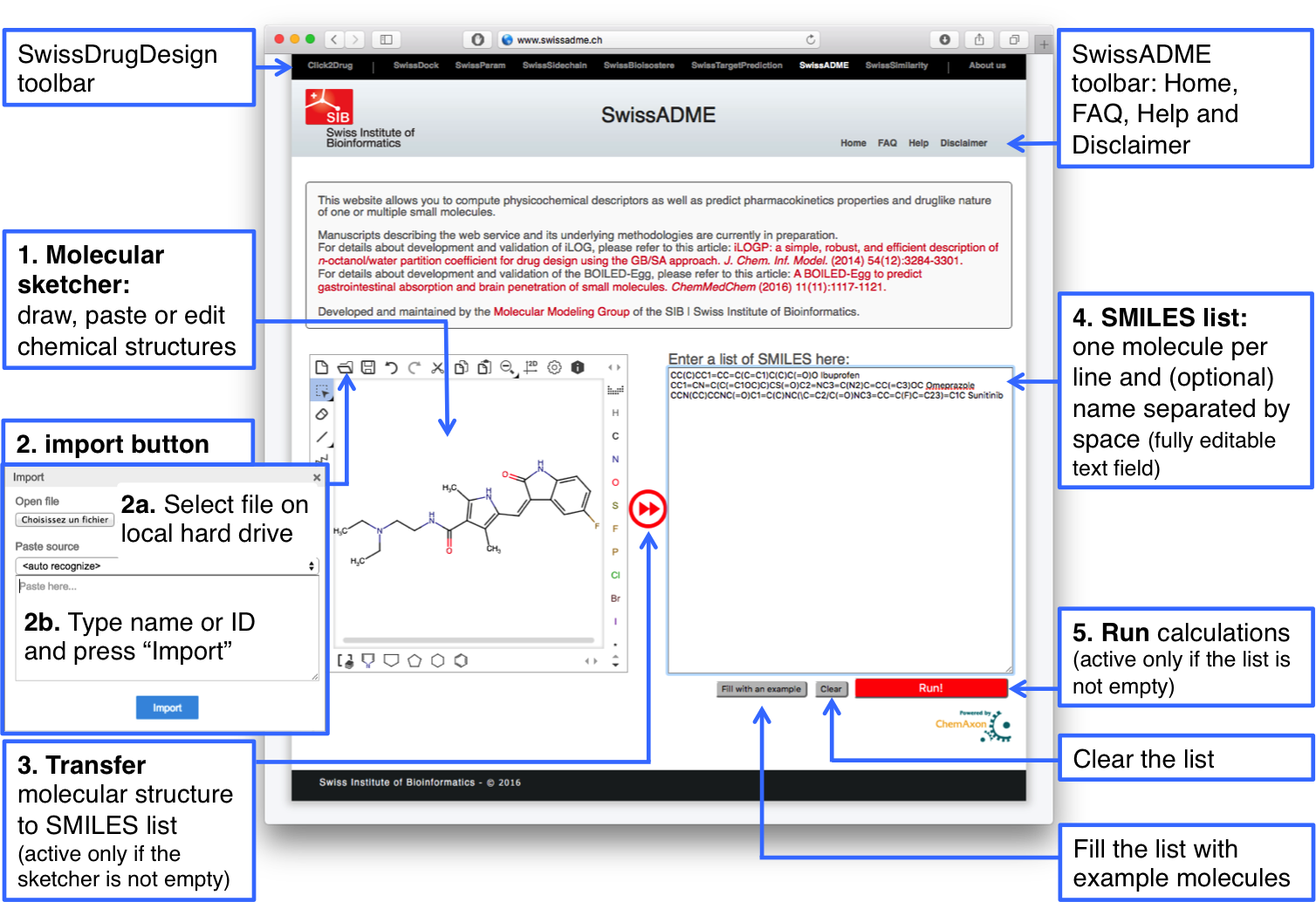 One or multiple molecules must be entered in the SMILES list field to be submitted to SwissADME calculations. Two manners to input molecules are detailed below:Molecular sketcher