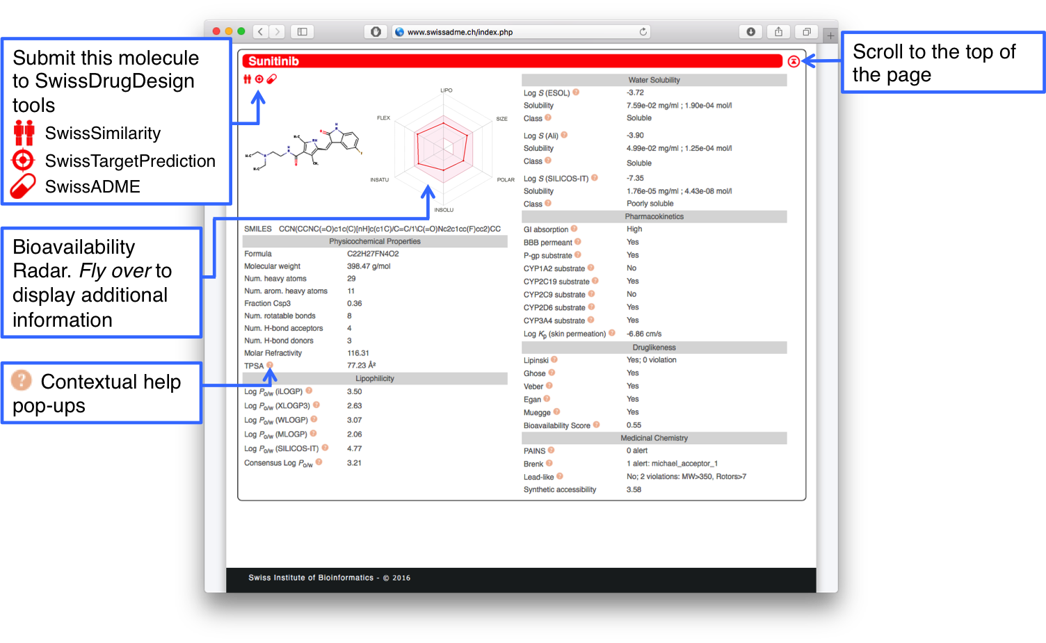 At the top of SwissADME web page is accessible a black toolbar that lets the user navigate within the different SwissDrugDesign tools.A second bar gives access to various information, among which the FAQ and Help pages as well as legal disclaimer and contacts.