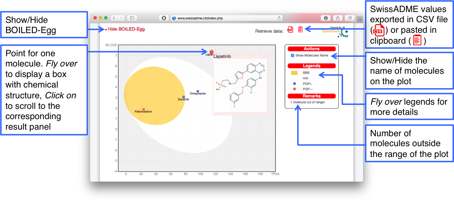 The graph itself is interactive in the sense that flying over a point makes a box appear with the structure of the molecule. You can access the related Output Panel by clicking on the point. Getting back to the BOILED-Egg is as simple as clicking on the up-arrow, top-right of the panel.